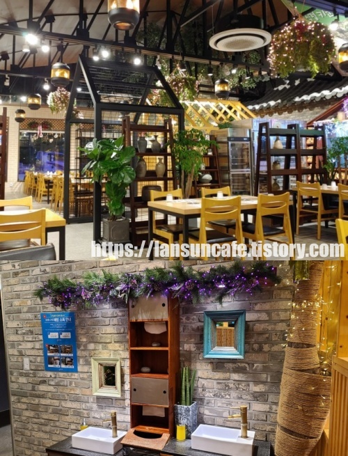 실외도 넓지만 실내도 널찍하고 가족단위의 대규모 또는 소규모로 이용이 가능했다. 마치 온실 속 같은 분위기의 실내에는 초록 초록한 식물들이 많아 시각적으로도 좋고, 깨끗하고 상쾌한 느낌을 받았고 특이한 조형물도 많아 인테리어에 신경을 많이 쓴 것 같다. 일죽 파크엘림의 아쉬운 점이 하나 있다면, 룸이 없는 것이었다. 단독으로 사용할 수 있는 룸은 없었지만 칸막이로 대체하고 있었다. 랜선 카페장의 자리는 통유리로 되어 있는 구석 쪽에 자리를 잡았고 파크엘림 공원이 보여 답답하지 않았다. 저녁이라 어둡지만 그래도 공원에서 놀겠다는 아이들이 걱정되었는데 창 너머로 아이들이 노는 걸 볼 수 있어서 안심할 수 있었다.